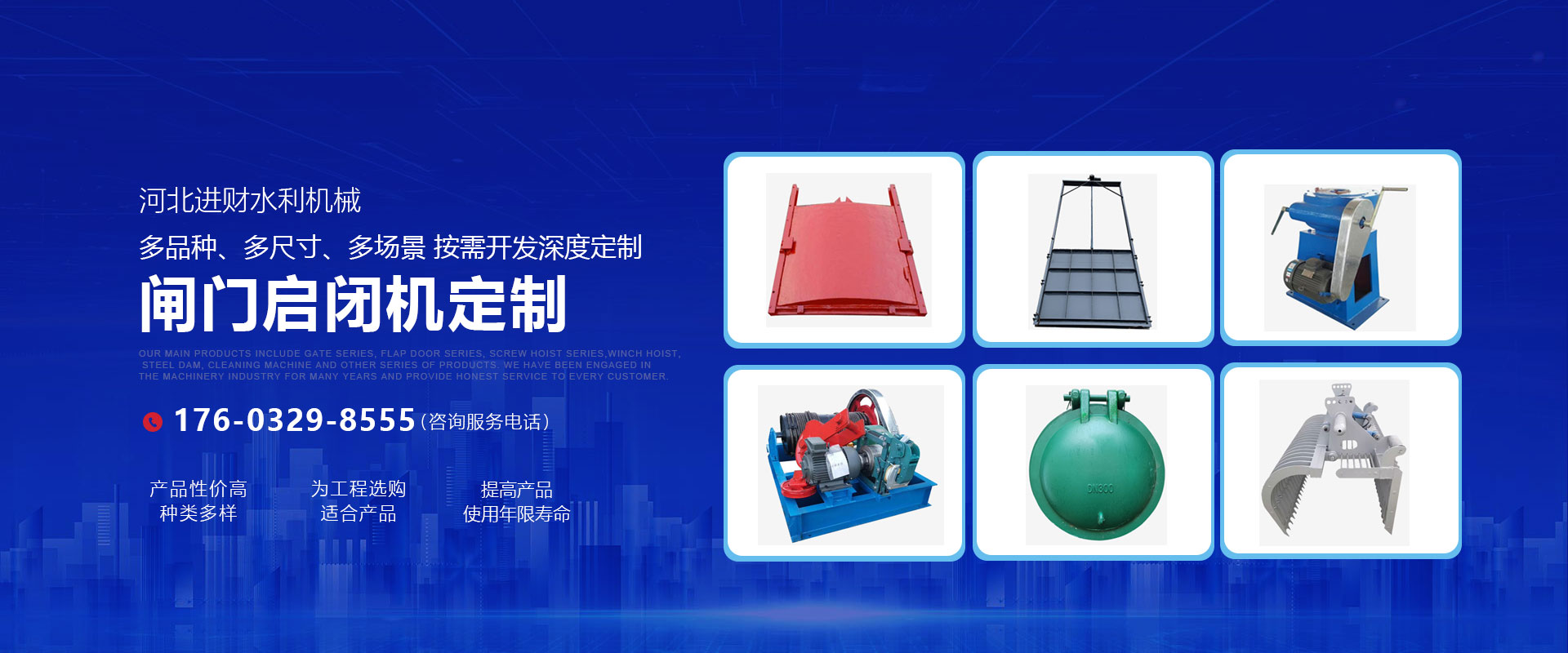 进财水利 · 产品中心主营产品有闸门系列、拍门系列、螺杆启闭机系列、卷扬式启闭机、钢坝、清污机等系列产品,我们从事机械行业多年,诚信服务每一位客户。
